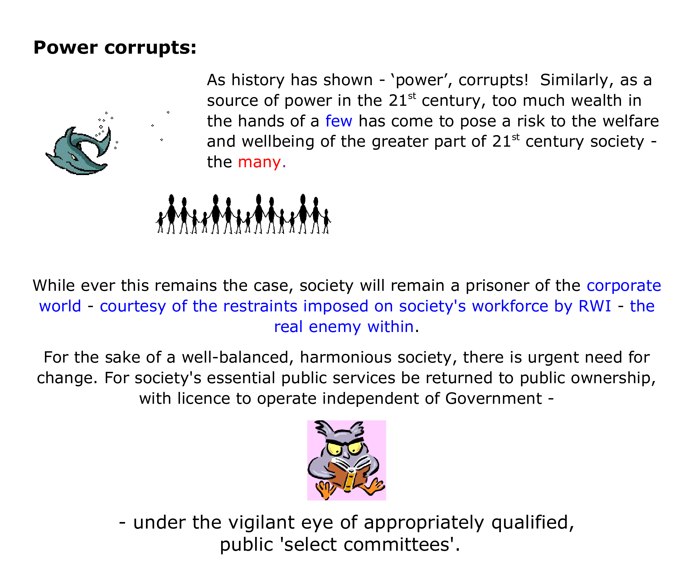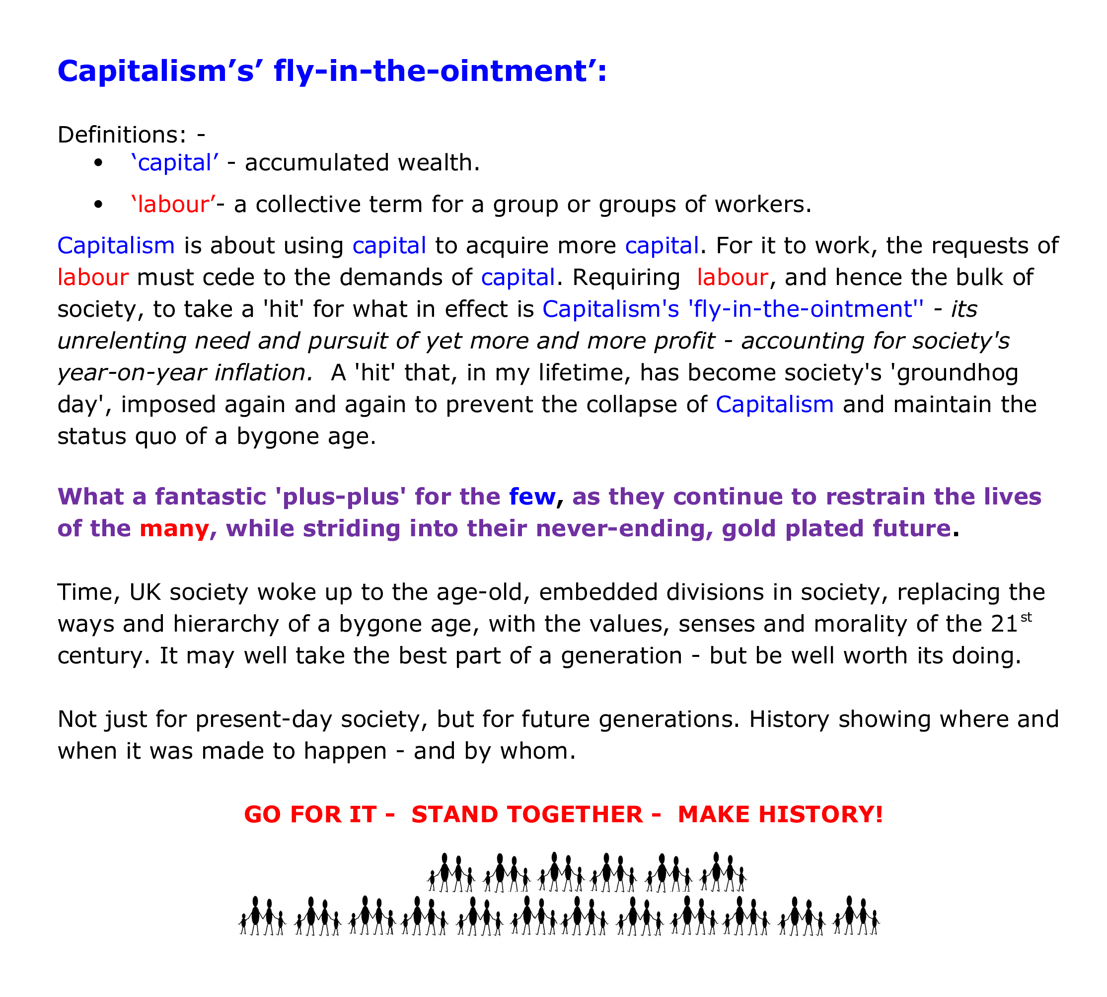 Time, UK society rejected the divisive, self-serving concepts of RWI and replaced it with ‘SOCIETYISM’. A new word and system that not only delivers the means to enjoy life to the full by all prepared to engage with society to the best of their ability, but also one where one’s contribution is regarded as no less worthy than that of any other, and incomes provide for a decent standard of living without the need of the state funded ‘top-ups’ that allows the few, not only to maintain control over the many, but also to sustain the status quo of a bygone age, at odds with the values and senses of 21st century society.