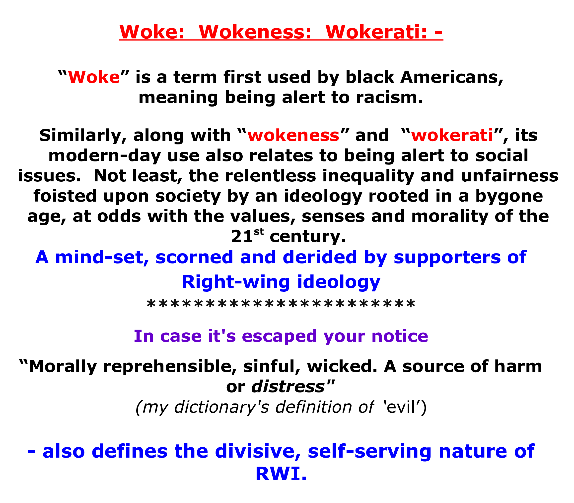 Championed by the guardians of a bygone age, RWI has had its’ day. Change is long overdue. For the prevailing ways of the distant past – ways, separating the few from the many, to be removed and replaced by values more befitting the senses and morality of 21st century society. A society brought together by a real sense of unity and interdependence, having been woke to the ingrained, self-serving nature of RWI and the direness of the consequences it continues to impose across the face of UK, 21st century society.
