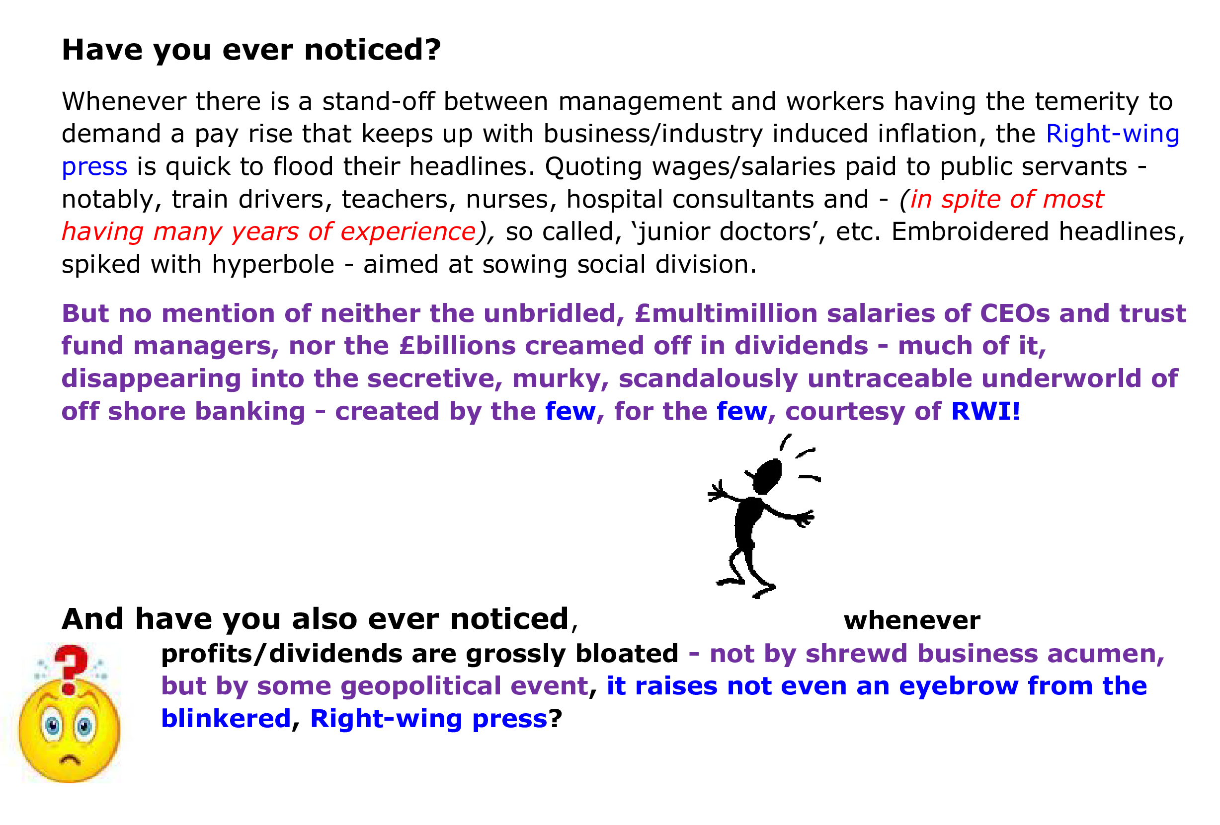 Along with the long trail of undelivered promises of ‘jam tomorrow’, the damning hallmark of RWI, stretching way back to early postWW2 years, will be lost on much of UK 21st century society – its innate, self-serving nature, constantly blocking the route to a more equitable society. While ever this is tolerated, the wealth created by the endeavours of the many will forever be channelled into the pockets of the few.